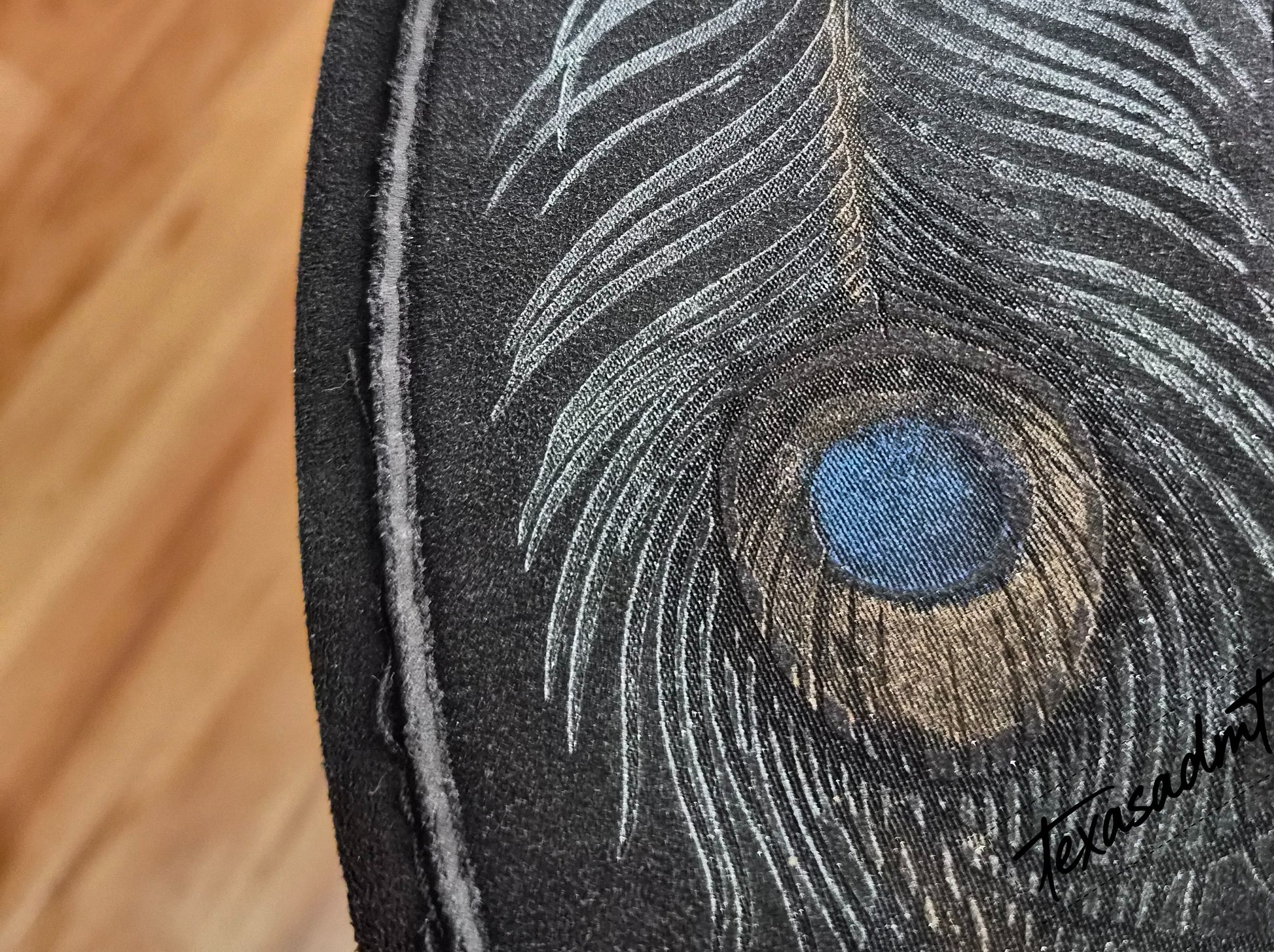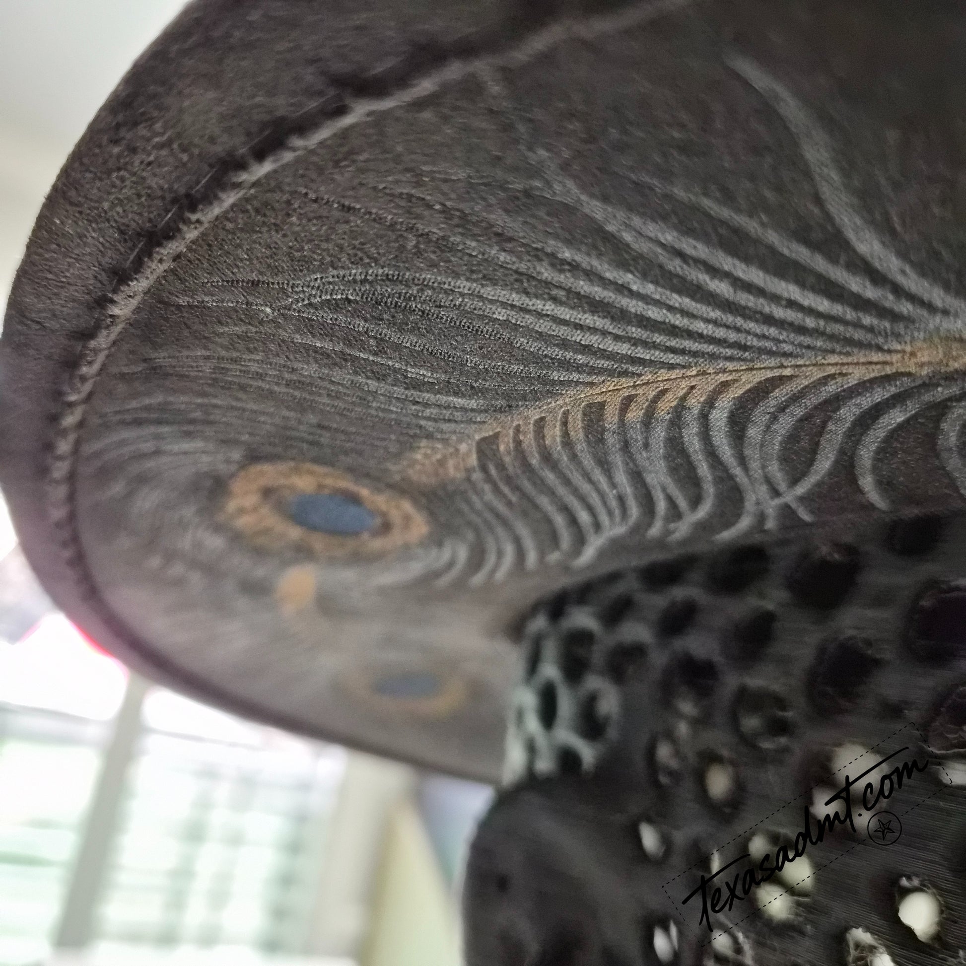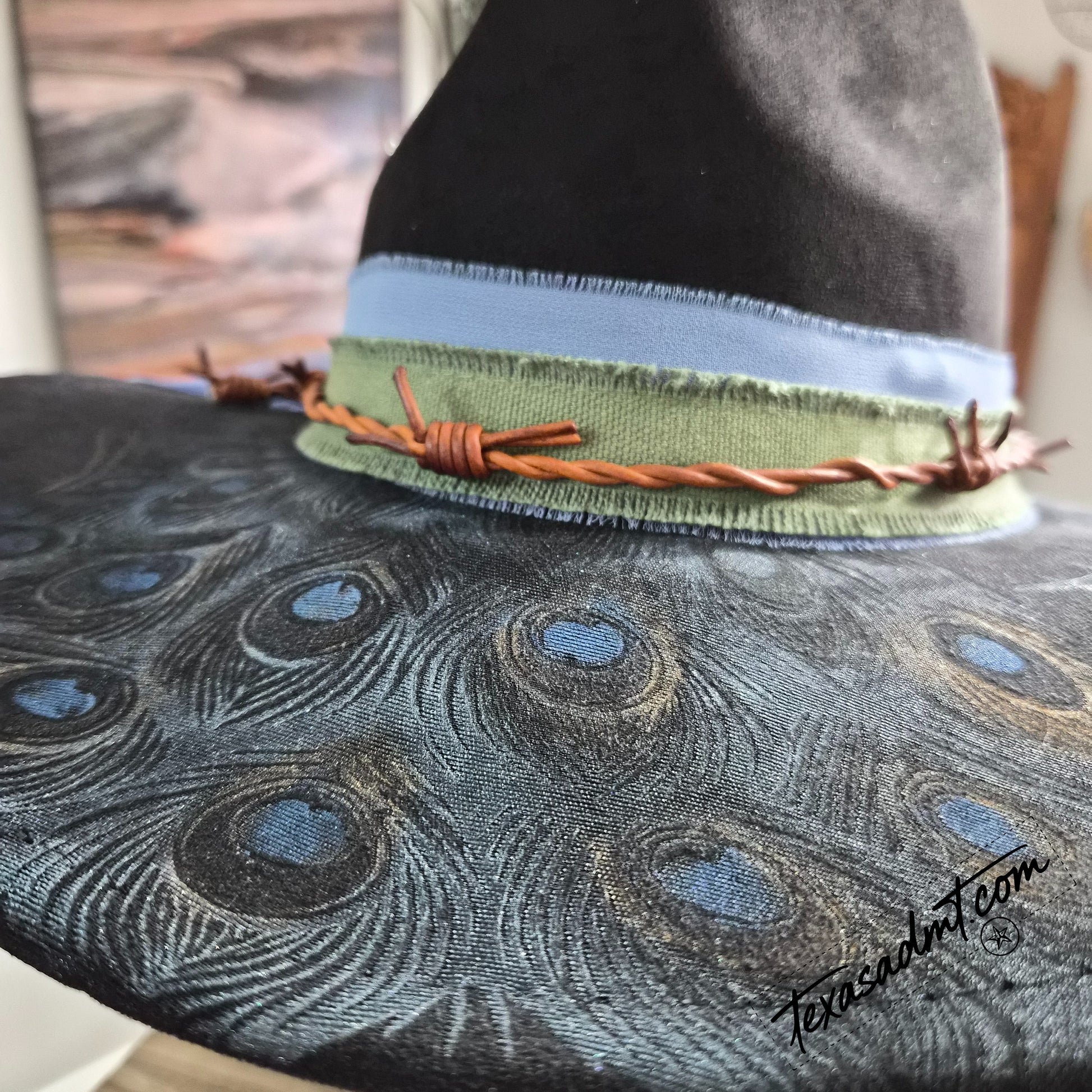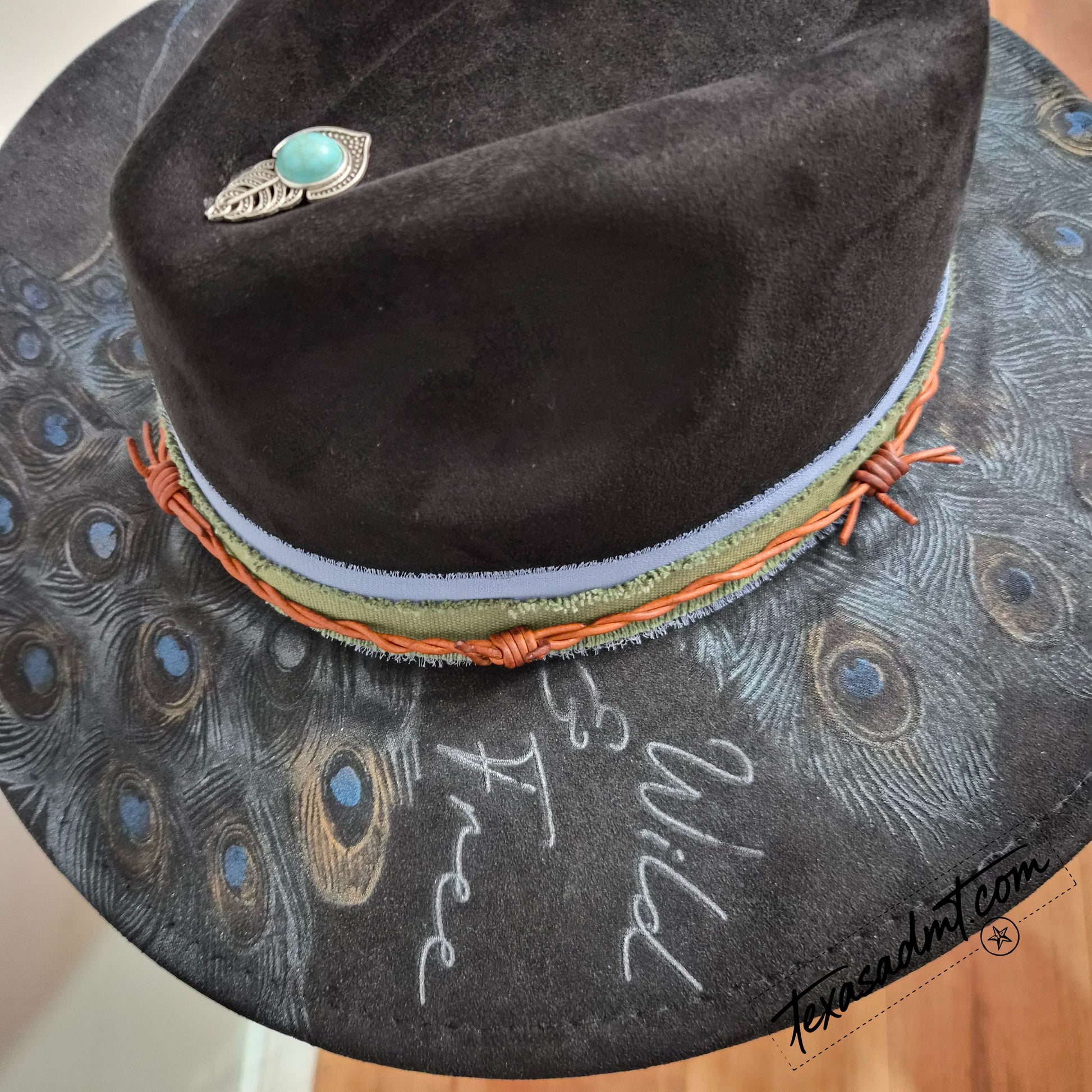 The Wild & Free is a bold, artistic expression of untamed spirit and handcrafted detail. Built on a rich black suede base, this custom design features a sweeping laser-engraved peacock feather pattern across the brim, accented with deep blue highlights that catch the light and create striking dimension. The handwritten “Wild & Free” inscription adds a personal, free-spirited touch that makes this piece truly one of a kind.